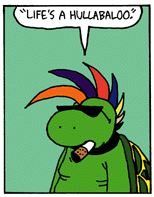 SNAP Even though he's over one hundred years of age, Snap is a turtle with a preference for the "punk" fashion style made popular in some movies during the 1980s (and in real life, apparently). He's never heard punk music before. He has no ambition whatsoever, but good luck tends to fall into his lap. |